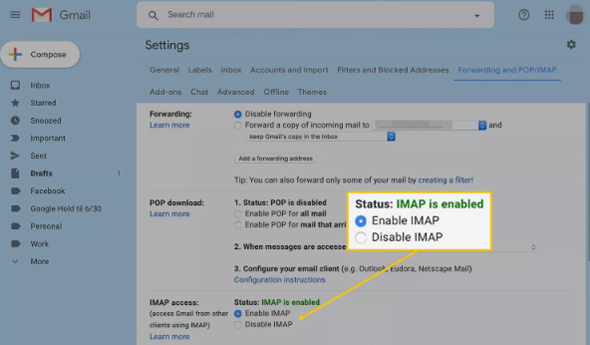Select the Forwarding and POP/IMAP tab and in the IMAP access section, select Enable IMAP.