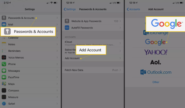 Go to Passwords & Accounts > Add Account, then choose Google.