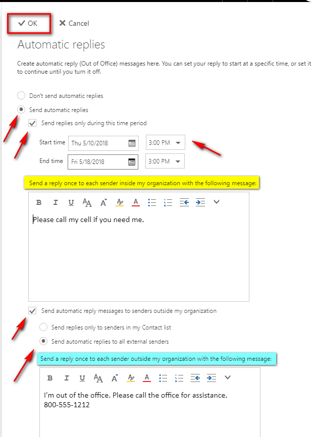 Fill out your desired settings and messages. Note that the bottom portion is dedicated to sending to those outside your organization. Once finished, click the OK button at the top.